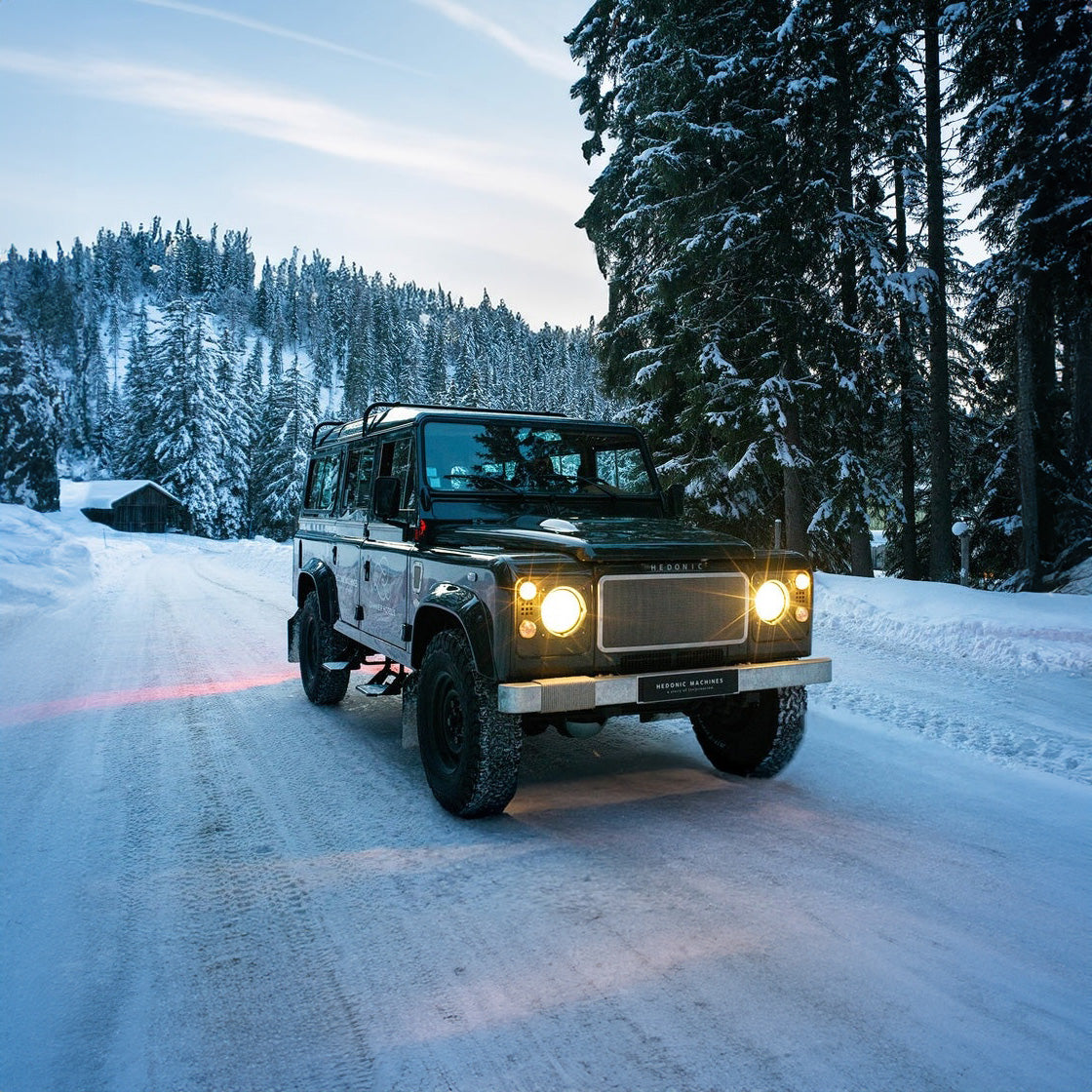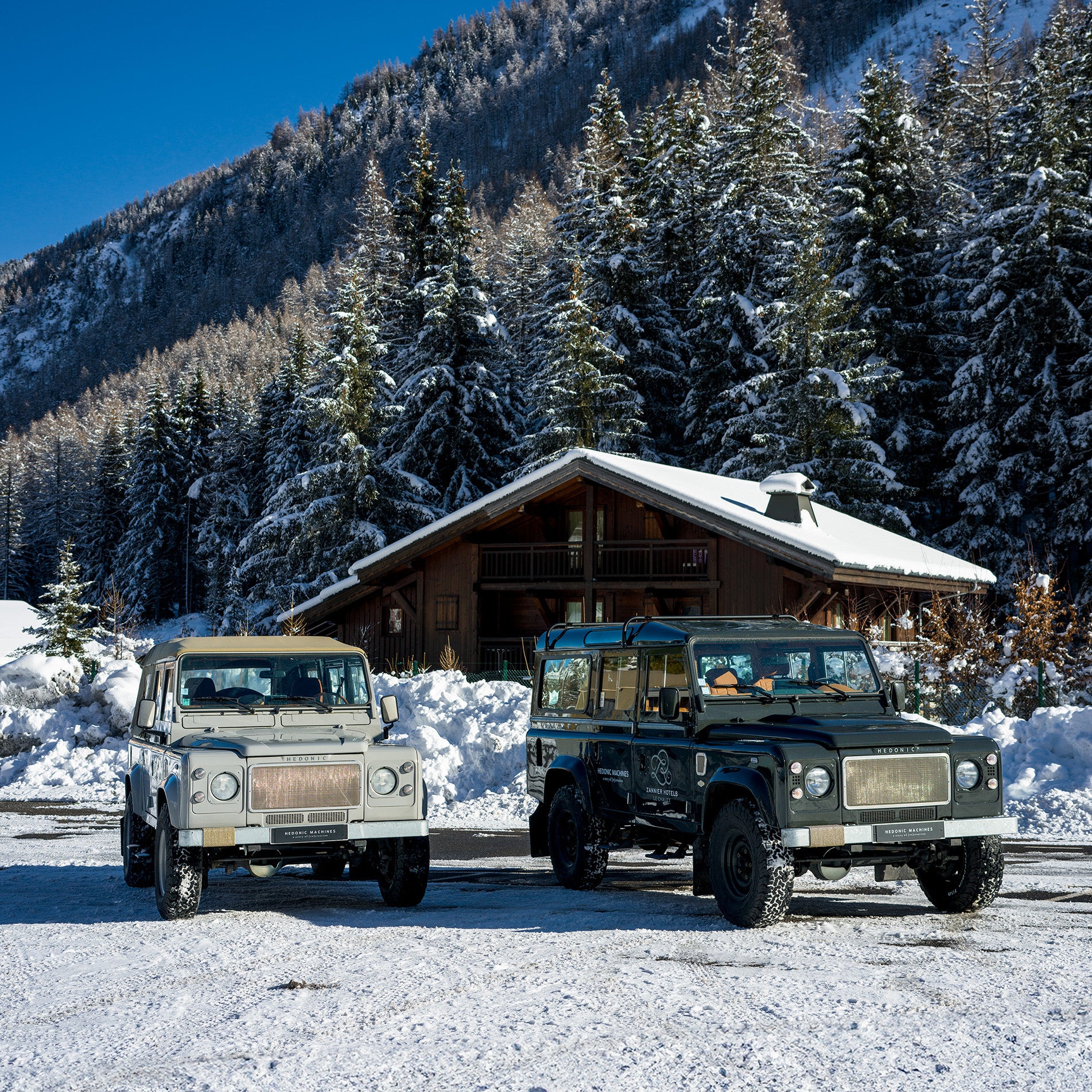 Pour offrir une expérience enrichie aux visiteurs de l'hôtel, Hedonic mets à disposition des Land Rover Defender [re]crées sur-mesure afin qu'ils puissent explorer le village.