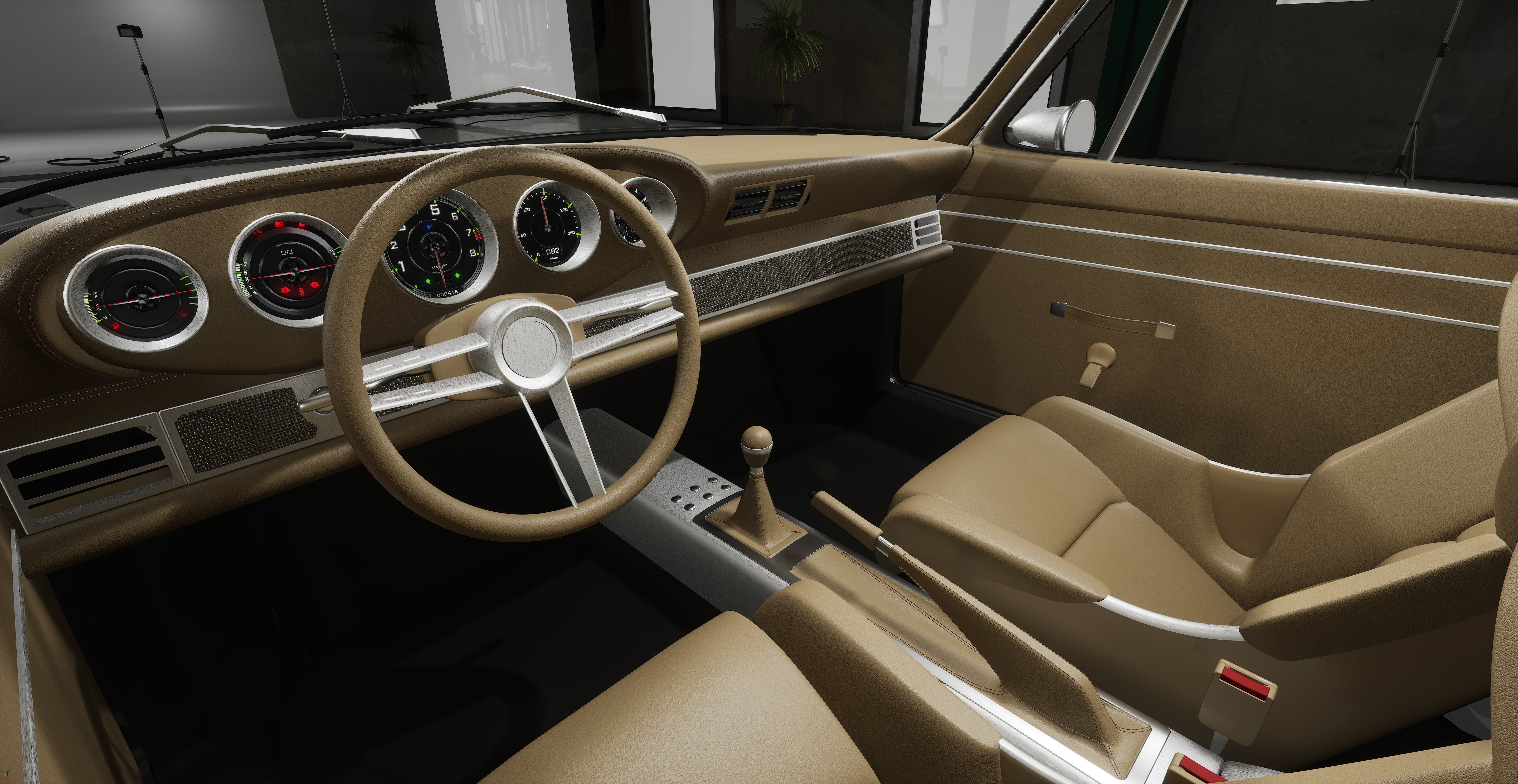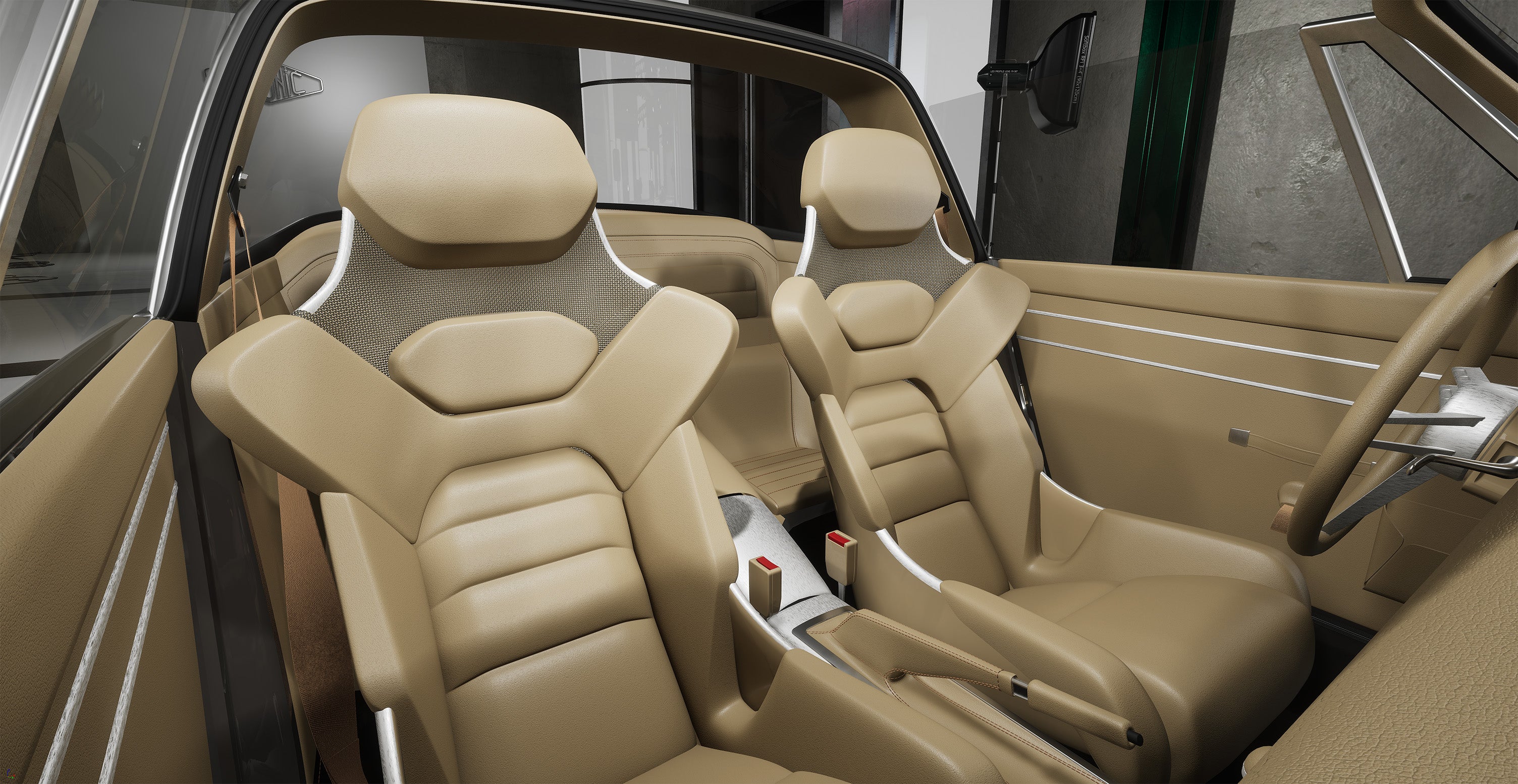 - Habitacle : modification complète des éléments de l’habitacle et de la sellerie (sièges, volant, planche de bord, tableau de bord, panneaux de portes, ciel de toit, moquette, tunnel central, banquette arrière, sièges arrières et plage arrière)