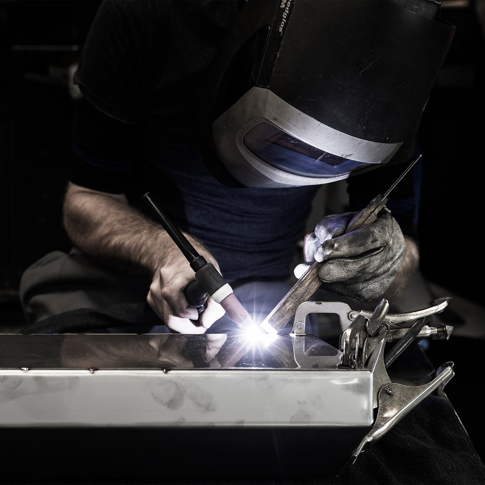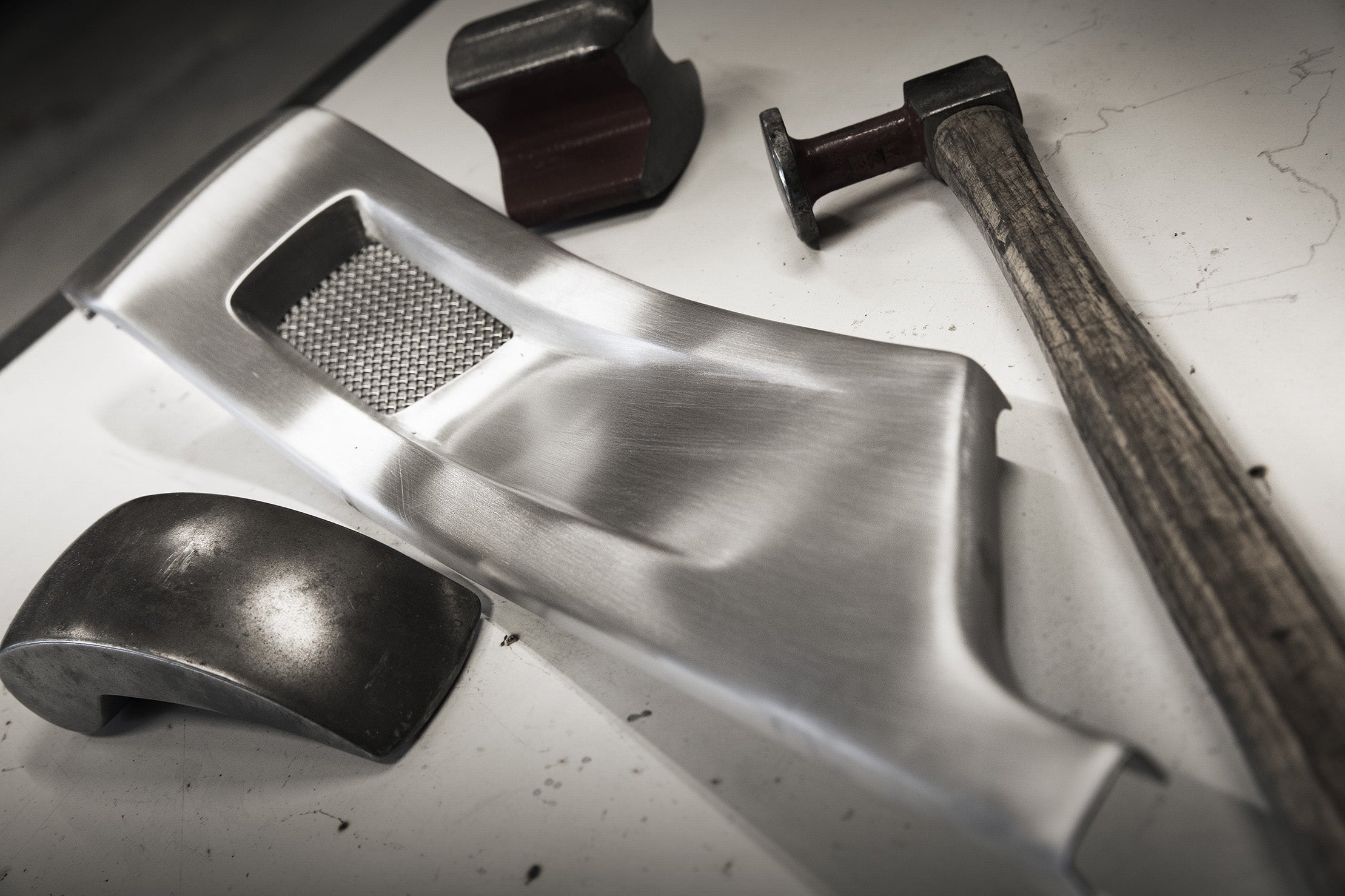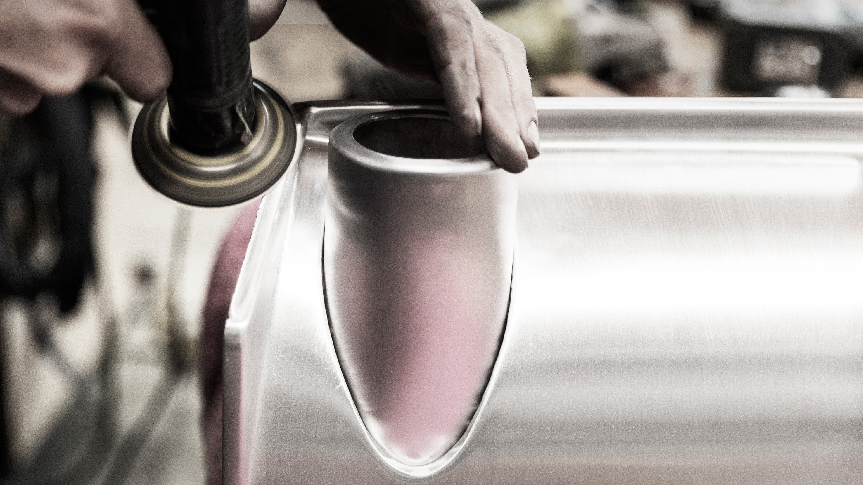 L'essentiel des pièces structurelles intégrées au projet, tant les modifications de carrosserie (ailes, bouclier avant, diffuseur, etc.) que les pièces d'intérieur (tunnel central, planche de bord, etc.) sont faites exclusivement à la main en aluminium par notre Maître formeur, de l'orfèvrerie. Il en est de même pour le travail de la sellerie.
